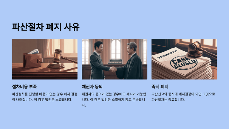 배당이 완료되면 법원은 채권자집회를 열어 파산관재인의 계산보고를 듣고, 채권자에게서 이의가 없으면 파산종결결정을 내린다. 파산절차가 종결되면 법인은 소멸한다. 다만 절차비용이 부족한 경우에는 법원이 비용부족을 이유로 폐지결정을 할 수 있고, 이 경우 법인은 소멸한다. 반면 채권자의 동의로 폐지하는 경우에는 법인이 존속한다.