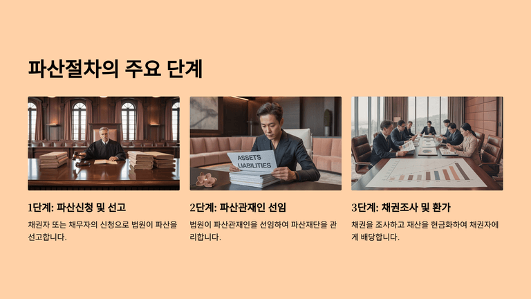 법인파산선고 후 4개월 이내에는 제1회 채권자집회를 열어 파산관재인이 업무를 보고하고, 필요 시 감사위원의 설치 여부와 영업의 폐지 또는 계속, 고가품의 보관 방법 등을 결의한다. 이어 법원은 채권조사절차를 진행하여 신고된 채권을 일반기일 또는 특별기일에서 조사·확정하며, 이의가 제기되지 않은 채권은 즉시 확정되어 파산채권자표에 기재되고 확정판결과 동일한 효력을 가진다.