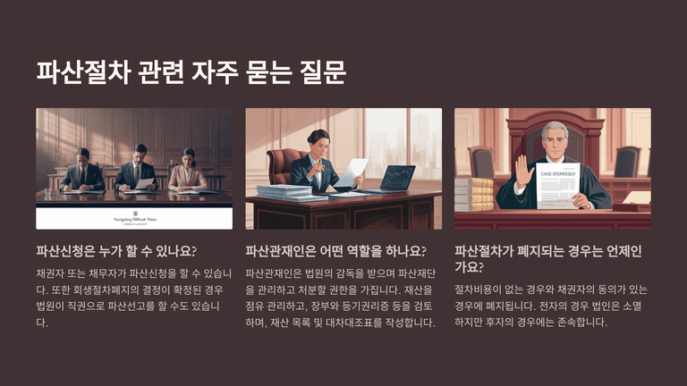 법인파산은 채권자 또는 채무자의 신청으로 시작되며, 법원이 채무자가 지급불능 또는 채무초과 상태에 있다고 인정하면 파산선고를 한다. 회생절차 폐지 결정이 확정된 경우에는 법원이 직권으로 파산선고를 할 수도 있다. 법원은 파산선고와 동시에 파산관재인을 선임하고, 파산관재인은 법원의 감독 아래 파산재단을 관리·처분하며 재산을 점유·목록화하고, 장부와 증빙서류를 인수·검토하는 등의 초기 조치를 수행한다.