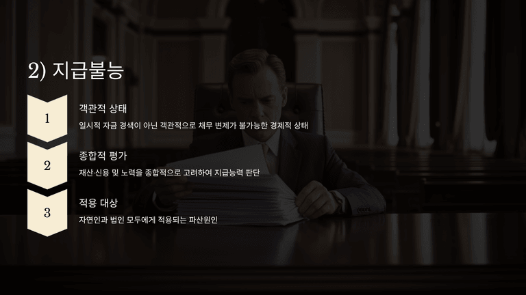 지급불능은 변제기에 도래한 채무를 일반적·계속적으로 변제할 수 없는 객관적 상태를 의미한다. 지급능력은 재산뿐 아니라 신용과 노력에서 비롯될 수 있으므로, 지급불능 여부는 재산·신용·노력을 종합해 객관적으로 판단한다. 일시적 자금 경색만으로는 지급불능이 성립하지 않으며, 이 요건은 자연인과 법인 모두에 적용된다.