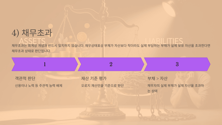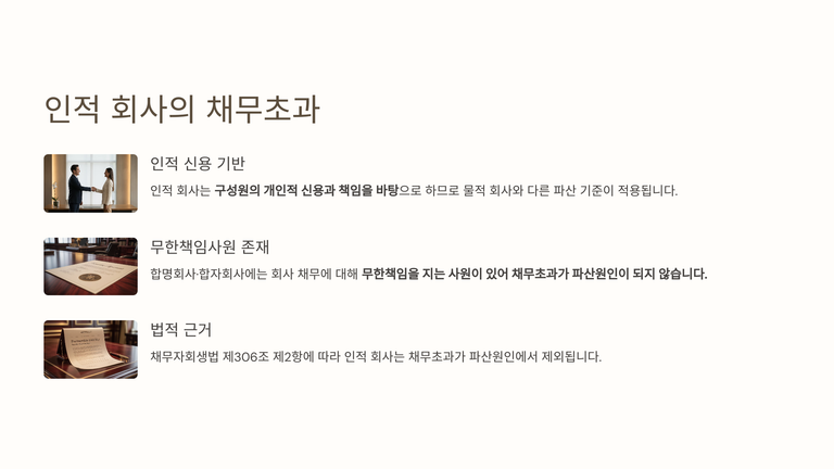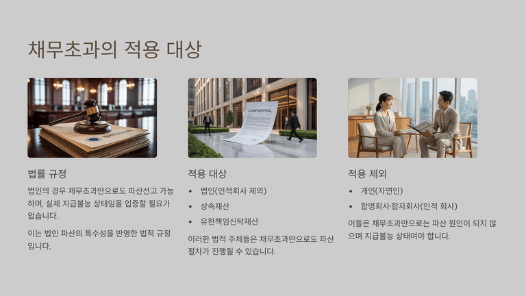 채무초과는 채무자가 보유 재산으로 채무 전액을 변제할 수 없는 상태를 뜻하며, 신용이나 노력 등 주관적 요소를 배제하고 재산만을 기준으로 판단한다. 회계상 수치와 일치하지 않더라도 실제 부채가 실제 자산을 초과하면 채무초과에 해당한다. 이 요건은 법인, 상속재산, 유한책임신탁재산에 한해 파산원인으로 인정되며 개인에게는 적용되지 않는다. 법인에 대해 채무초과를 별도 파산원인으로 둔 것은 물적 회사에서 법인 재산만이 담보가 되므로 채무초과 상태의 사업 지속이 채권자 손실을 확대하기 때문이며, 무한책임사원이 존재하는 인적 회사에는 채무초과가 파산원인이 되지 않는다.