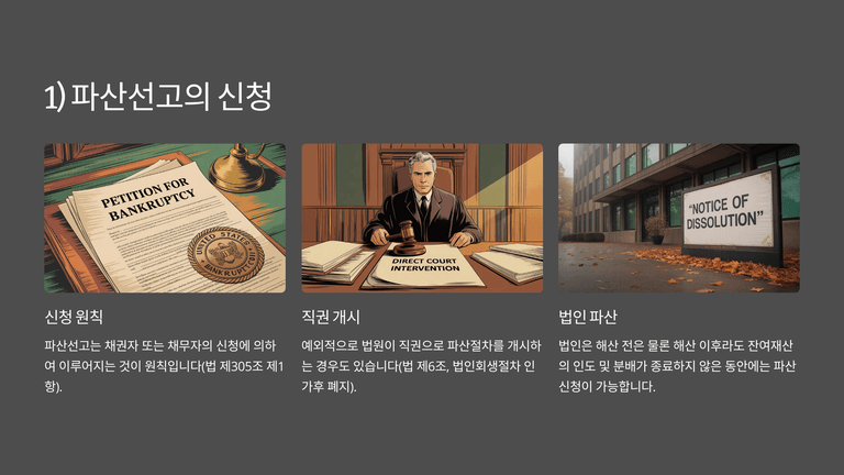 파산선고는 원칙적으로 채권자 또는 채무자의 신청에 의해 이루어진다(법 제305조 제1항). 예외적으로 법원은 법인회생절차가 인가 후 폐지되어 그 폐지결정이 확정된 경우 직권으로 파산선고를 할 수 있다(법 제6조). 법인은 해산 전후를 불문하고 잔여재산의 인도·분배가 종료하지 않은 동안에는 파산신청이 가능하며, 해산한 법인도 파산 목적의 범위에서는 존속한다(법 제328조).