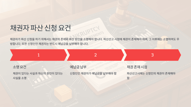 채권자는 파산채권자가 될 수 있는 자이면 신청할 수 있으며, 채권의 존재와 파산원인의 존재를 소명하면 된다. 우선권·후순위, 기한미도래·장래·정지조건부 채권자도 신청권을 가진다. 별제권자는 담보에서 전액 변제를 받지 못하는 경우 파산채권자로 권리를 행사할 수 있으므로 신청할 수 있고, 별제권을 미리 포기할 필요는 없다. 재단채권자는 원칙적으로 신청권이 없으나, 실무상 임금채권자 보호를 위해 예외가 논의된 바가 있다.