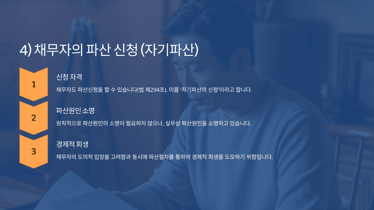 채무자도 자기파산을 신청할 수 있다(법 제294조). 실무상 채무자는 파산원인을 소명하는 것이 통상적이다. 법인인 채무자의 경우 합명·합자회사는 무한책임사원, 주식회사·유한회사는 이사, 청산 중인 법인은 청산인, 그 밖의 법인 또는 법인 아닌 사단·재단은 대표자나 관리인이 신청한다(법 제295조, 제297조). 이사·무한책임사원·청산인의 일부만 신청하는 때에는 파산원인을 소명하여야 한다(법 제296조). 청산 중 법인의 재산이 채무 전액을 변제하기에 부족함이 명백하면 청산인은 지체 없이 파산선고를 신청하여야 하며, 이를 게을리하면 과태료 대상이 된다(상법 제635조 제1항 제12호).