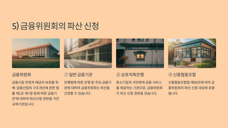금융기관, 신용협동조합, 상호저축은행 등에 대해서는 금융위원회가 파산을 신청할 수 있다(금융산업의 구조개선에 관한 법률 제16조, 신용협동조합법 제88조). 금융감독원장 또는 파산참가기관은 금융위원회에 신청을 건의할 수 있다.
