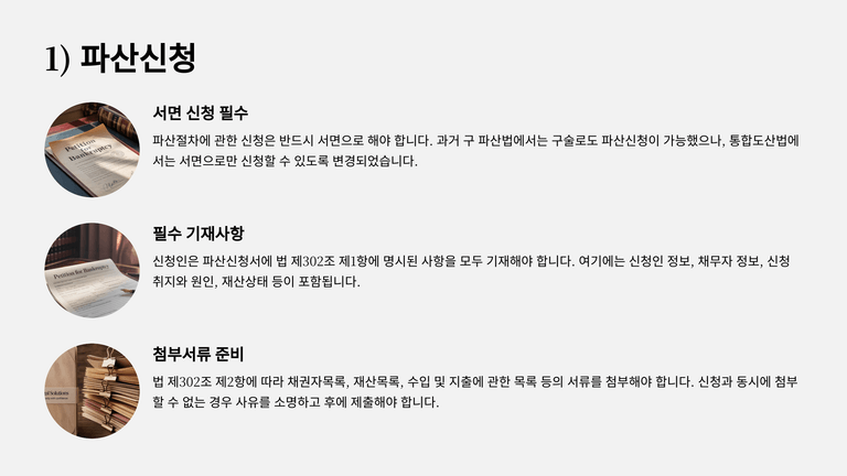 파산절차의 신청은 반드시 서면으로 하여야 한다(법 제302조). 이는 구 파산법에서 허용하던 구술신청을 배제하고, 통합도산법에서는 서면방식만을 인정함으로써 절차의 명확성과 형식을 강화한 것이다. 신청인은 파산신청서에 법 제302조 제1항의 사항을 기재하고, 채권자목록·재산목록 등 제2항의 서류를 첨부하여 제출하여야 한다.