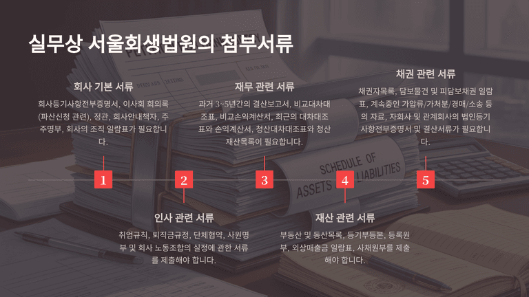첨부서류에는 대법원규칙상 등기사항전부증명서, 정관, 이사회 회의록, 소명자료 등이 포함되며, 서울회생법원은 실무상 결산서, 손익계산서, 주주명부, 채권자목록, 담보물 일람표 등 20여 종의 세부 서류를 요구한다. 채권자가 신청하는 경우에는 채권의 존재와 파산원인을 소명하여야 하며, 채무자가 스스로 신청하는 ‘자기파산’의 경우에도 실무상 동일하게 파산원인을 소명한다.