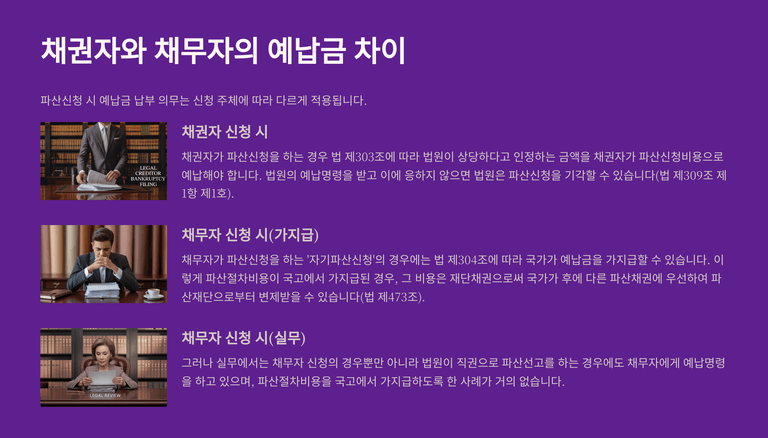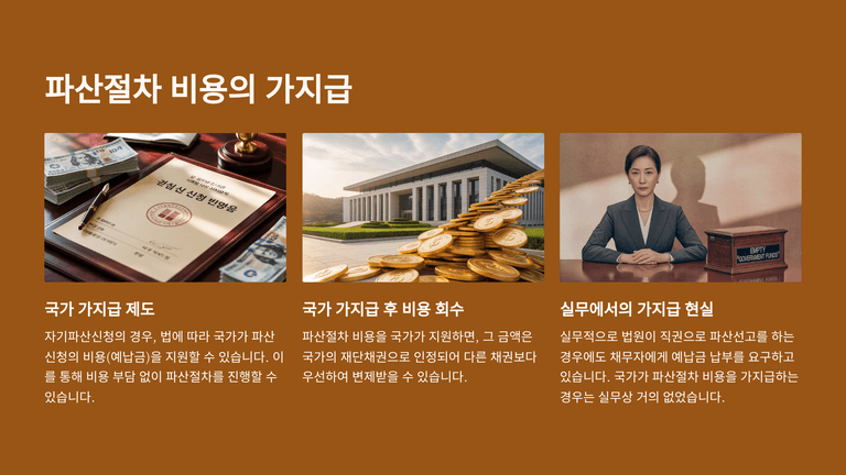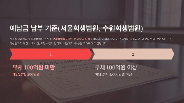 다만 실무상 국고 가지급은 거의 허용되지 않으며, 채무자 신청이나 직권파산의 경우에도 법원이 예납명령을 하는 것이 일반적이다. 서울회생법원과 수원회생법원은 예납금 부담 완화를 위해 2024년 10월부터 부채총액 100억 원 미만 법인에 대해 예납금을 500만 원으로 통일하였다. 예납금 산정 시에는 채무자의 최근 재무제표상 부채총액, 재단규모, 절차 소요기간, 채권자 수 등을 종합적으로 고려하여 결정한다.