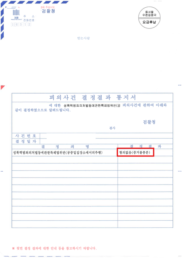 검찰은 조민성 변호사의 의견서를 채택하여 의뢰인에 대해 불기소(혐의없음) 결정을 통지했습니다.