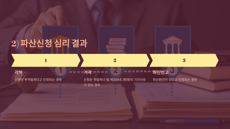 심리 결과 신청이 부적법한 경우에는 각하결정을 내리고, 신청이 적법하더라도 법 제309조 제1항에서 정한 사유(예: 비용 미납, 회생절차 진행 중, 파산원인 부존재 등)가 있는 경우에는 기각결정을 내린다. 반면 파산원인이 인정되면 파산선고를 한다.