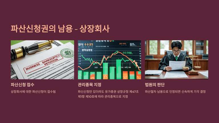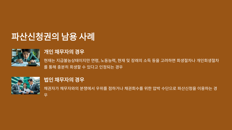 최근 판례와 실무에서는 이러한 ‘파산신청권의 실질적 남용’이 문제 되는 사례가 증가하고 있다. 개인의 경우 회생 가능성이 충분함에도 불구하고 파산을 신청하는 때, 법인의 경우 채권자가 분쟁의 압박수단으로 파산신청을 이용하는 때가 이에 해당한다. 특히 상장회사는 파산신청만으로도 관리종목으로 지정되므로, 법원은 남용으로 판단되면 신속히 기각하고 있다.