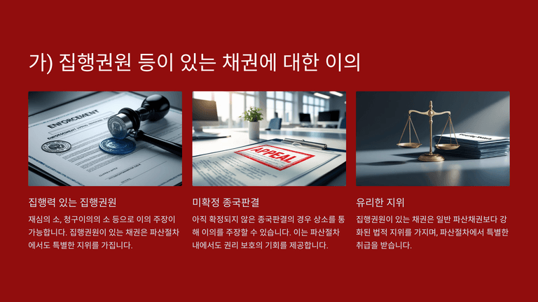 이의채권에 이미 집행력 있는 집행권원이나 종국판결이 있는 경우에는, 이의자는 일반 소송절차(재심, 청구이의, 상소 등)를 통해서만 다툴 수 있다. 또한 파산선고 당시 이의채권과 관련된 소송이 계속 중이었다면, 채권자는 이의자 전원을 상대로 소송을 수계해야 한다. 이 경우 원고와 피고의 지위에 따라 청구취지를 “파산채권이 있음을 확인한다”는 내용으로 변경해야 하며, 소송 절차는 파산채권확정을 위한 수계로 전환된다.