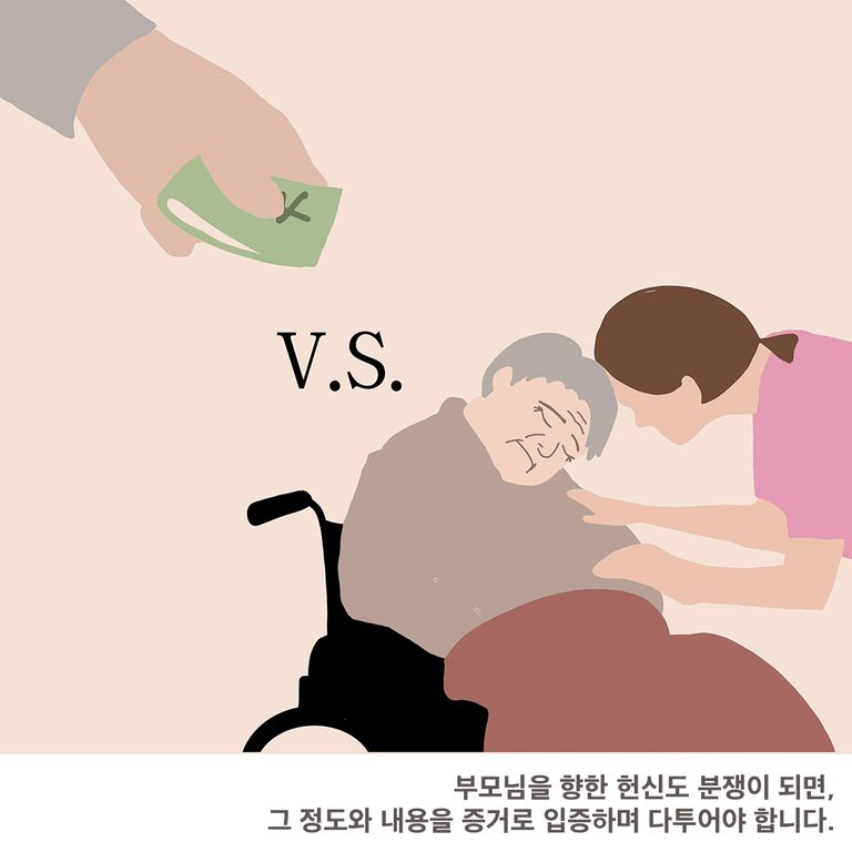 다른 형제자매의 도움 없이 혼자서 수년간 중병에 걸린 부모를 간호하며 병수발을 들고 치료비를 부담한 경우 (자신의 직업이나 가정을 희생한 정도가 입증되어야 함)
