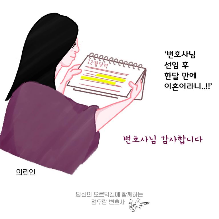 정우람 변호사는 의뢰인의 사건을 수임한 지 단 한 달여 만에 2회 조정기일에서 조정이혼을 성립할 수 있었습니다. 이는 의뢰인의 부당함을 적극 피력하고, 그에 따른 증거도 충분히 확보한 결과입니다. 이를 바탕으로 유리한 위치에서 이혼 조정이 성립될 수 있었습니다.