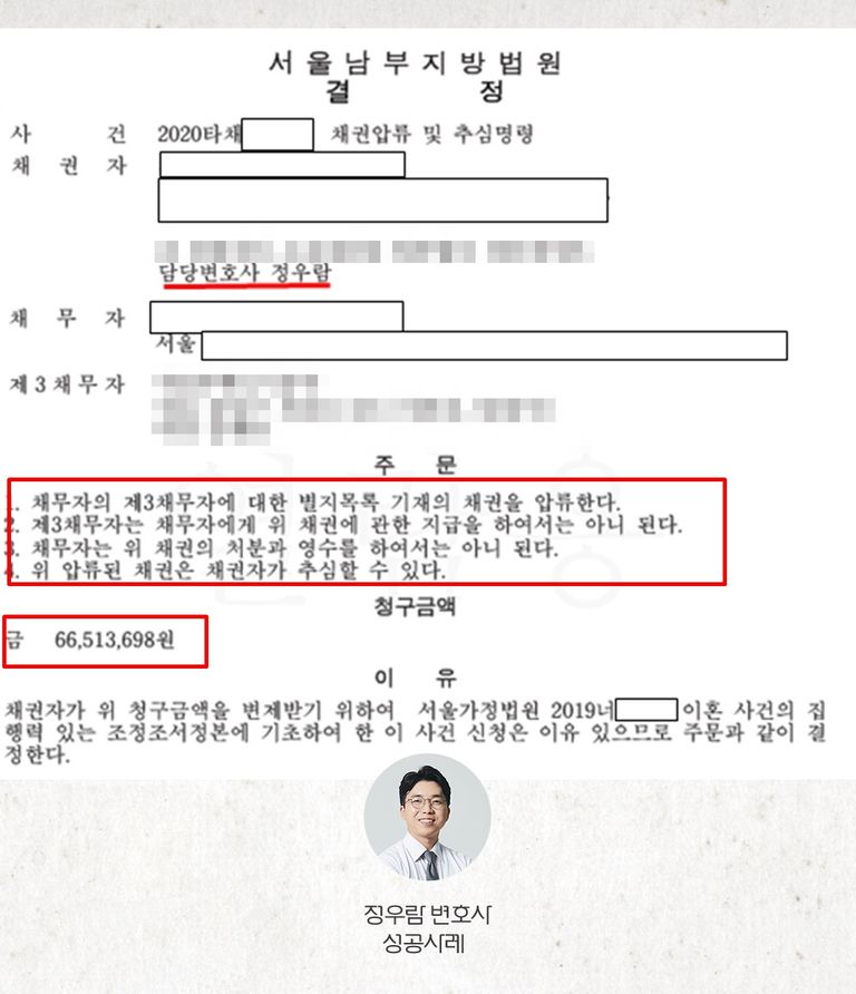 1) 정우람 변호사는 남편의 임대차보증금 채권 압류 및 추심명령을 신청함.