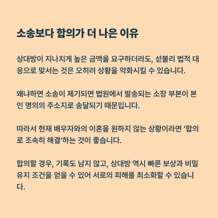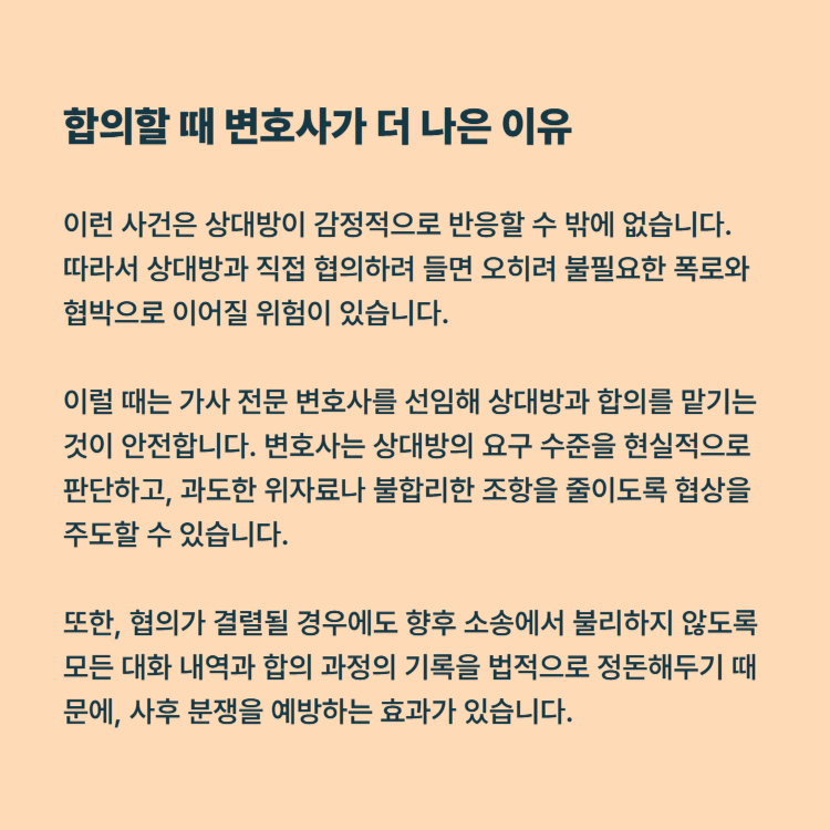 이럴 때는 반드시 경험이 풍부한 변호사를 선임해 객관적 조율을 맡기는 것이 안전합니다. 변호사는 상대방의 요구 수준을 현실적으로 판단하고, 과도한 위자료나 불합리한 조항을 줄이도록 협상을 주도할 수 있습니다.