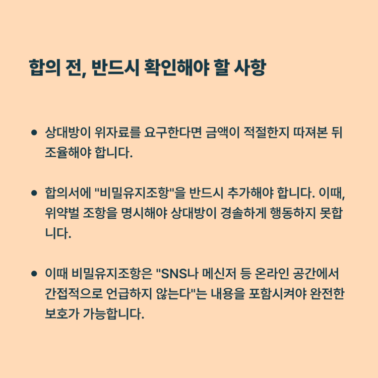 따라서 상대방이 과도한 금액을 요구하더라도 감정적으로 대응하지 말고, 즉시 변호사와 상의하여 합리적인 조건으로 합의서를 작성하며, 비밀유지 및 위약벌 조항을 반드시 포함해야 합니다.