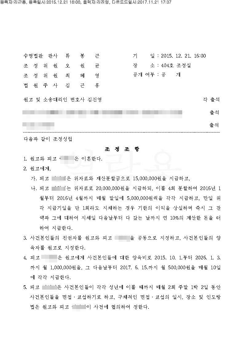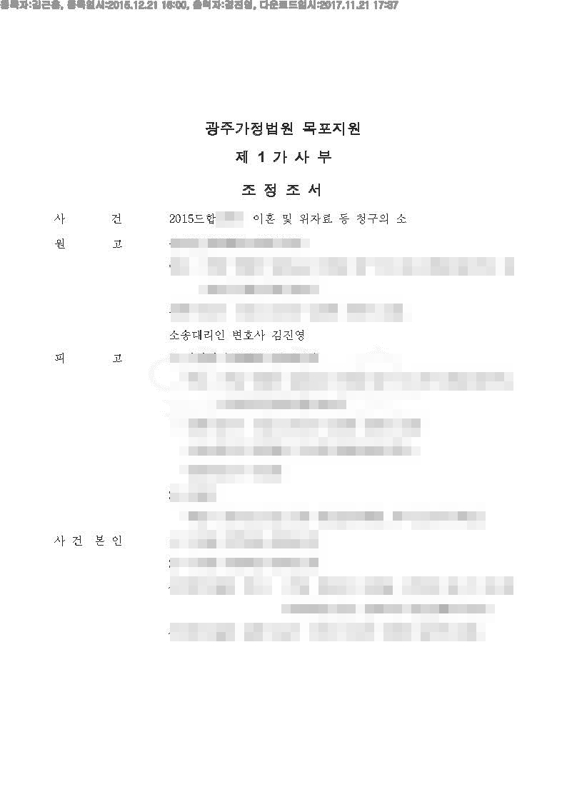 결과 : 저희 법률사무소에서 소송을 진행하였으며 법원에서 조정에 회부하였으며, 저희 대표변호사인 김진영변호사님께서 조정을 잘 이끌어 낼 수 있었습니다. 조정내용으로는 피고1에게는 위자료로 1500만원을 피고2에게는 위자료로 2000만원을 지급받았으며 자녀들의 양육권도 가져오고 양육비 월 100만원 받으실수 있도록 조정을 성립시켰습니다.