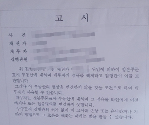 게시문 부착: 부동산 내부의 잘 보이는 곳에 점유를 타인에게 이전하지 말라는 내용의 법원 명령문(고시문)을 부착합니다. 통상 신발장 근처에 부착하는 것 같습니다. 채무자가 부재중이더라도 열쇠공이 개문하고 고시문을 부착할 수 있습니다(이러한 상황을 대비하기 위해 증인과 열쇠공이 필요합니다).