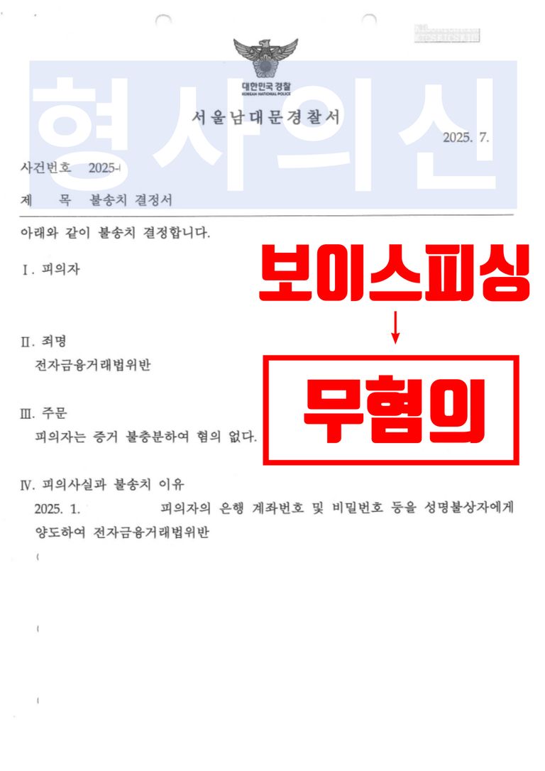 서울남대문경찰서 수사관은 법률사무소 유(唯)의 형사전문변호사가 제출한 자수서와 진술 내용 및 증거들을 모두 받아들여, 피의자가 전자금융 접근매체를 양도하였다거나 그 대가를 수수 또는 약속하면서 대여하였다는 증거가 없다는 점을 이유로 ‘혐의없음(증거불충분)’ 처분을 하였습니다.