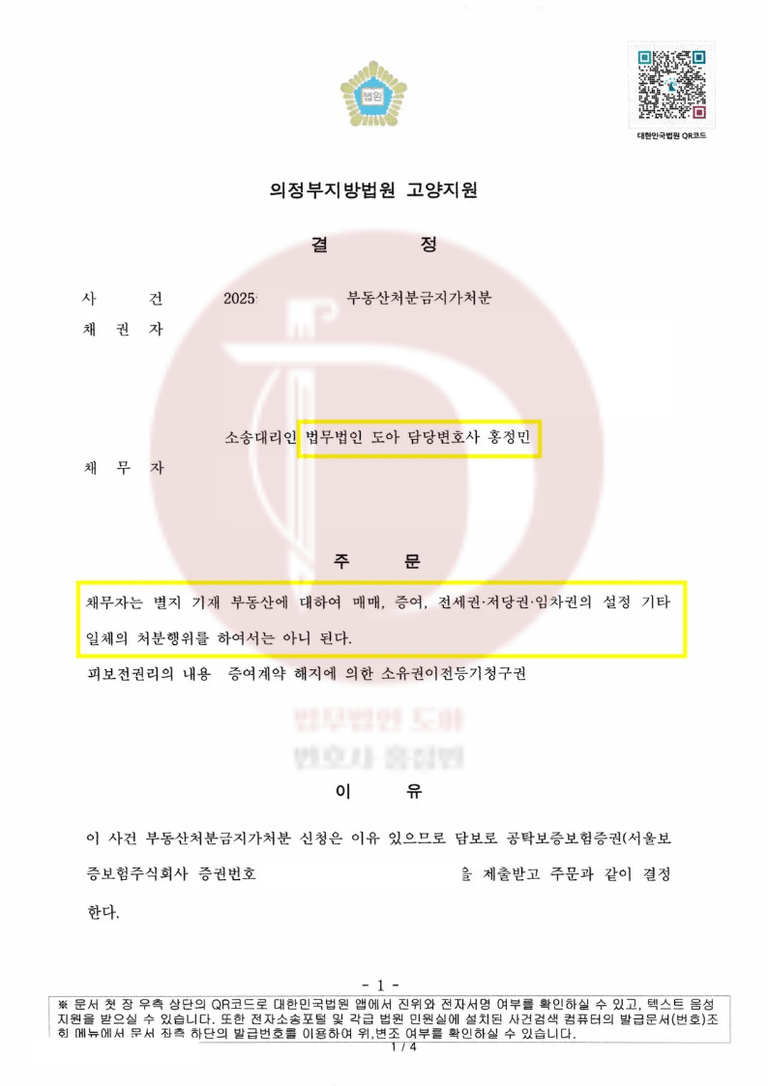 법원은 위와 같은 저희의 주장을 받아들여, 마침내 부동산처분금지가처분 신청을 인용하였습니다!