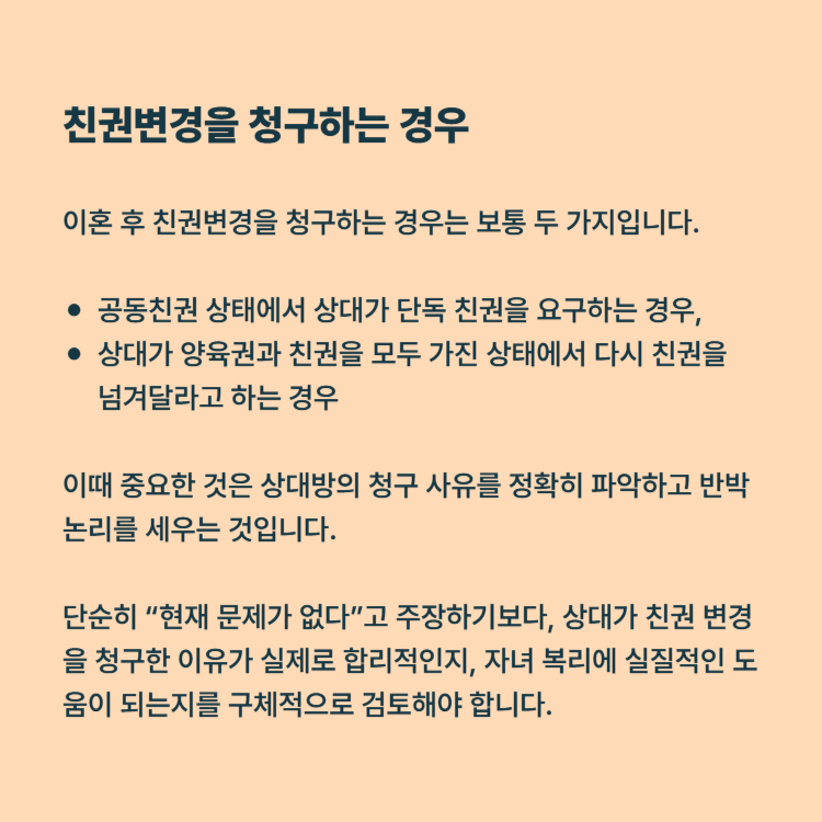 이때 중요한 것은 상대방의 청구 사유를 정확히 파악하고 반박 논리를 세우는 것입니다. 단순히 “현재 문제가 없다”고 주장하기보다, 상대가 친권 변경을 청구한 이유가 실제로 합리적인지, 자녀 복리에 실질적인 도움이 되는지를 구체적으로 검토해야 합니다.