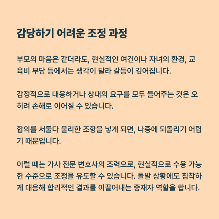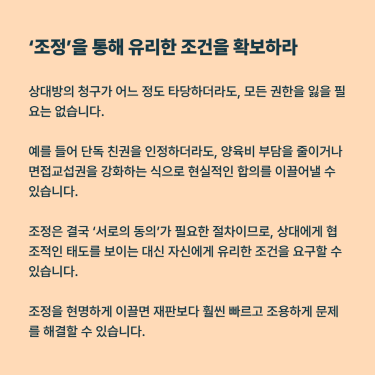 불리한 요구를 받았다면, 감정적으로 대응하기보다 법적으로 가능한 최선의 방어책을 세우는 것이 중요합니다. 조정을 통해 현실적인 조건을 이끌어내고, 자녀와의 관계를 지킬 수 있도록 준비해야 합니다.