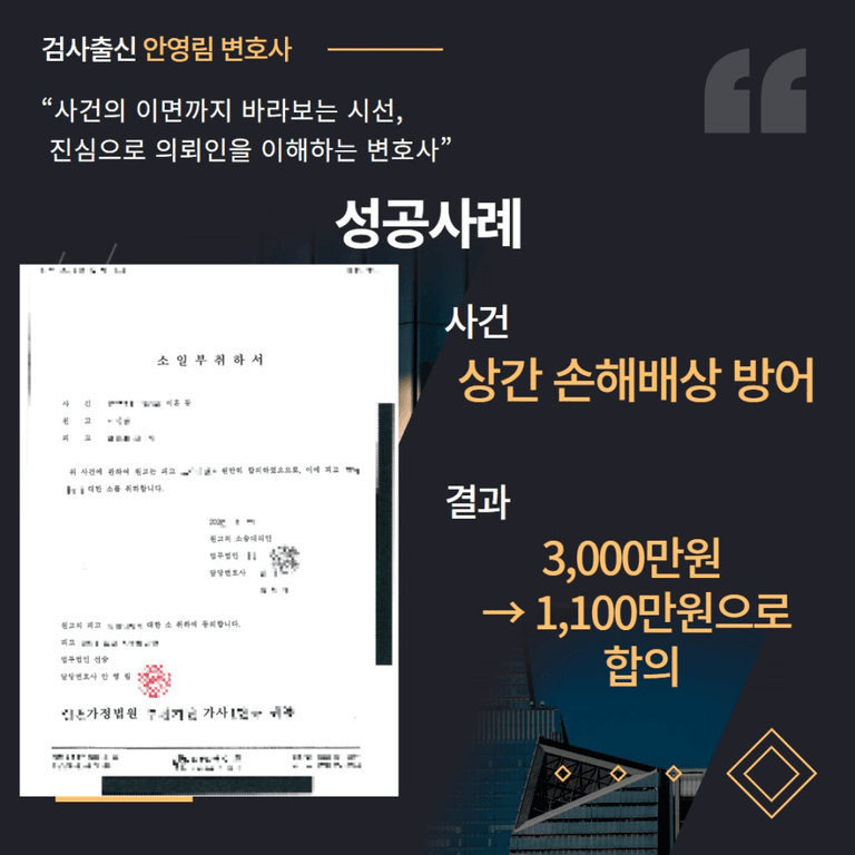 - 합의가 성사된 후, 원고는 소를 취하하였고 사건은 조기에 종결되었습니다. 이로써 의뢰인은 불필요한 법정 공방이나 장기 재판의 부담을 피할 수 있었으며, 개인적인 생활과 가정에도 불필요한 노출 없이 사건을 마무리할 수 있었습니다.