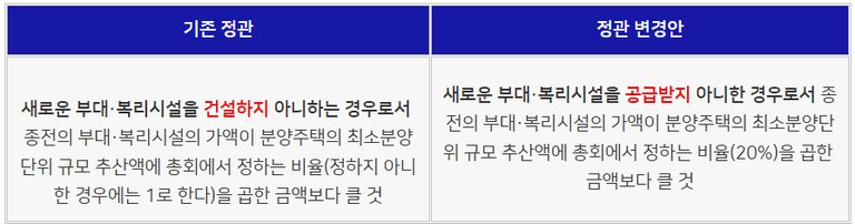 나. 기존 부대시설ㆍ복리시설의 가액에서 새로 공급받는 부대시설ㆍ복리시설의 추산액을 뺀 금액이 분양주택 중 최소분양단위규모의 추산액에 정관등으로 정하는 비율을 곱한 가액보다 클 것