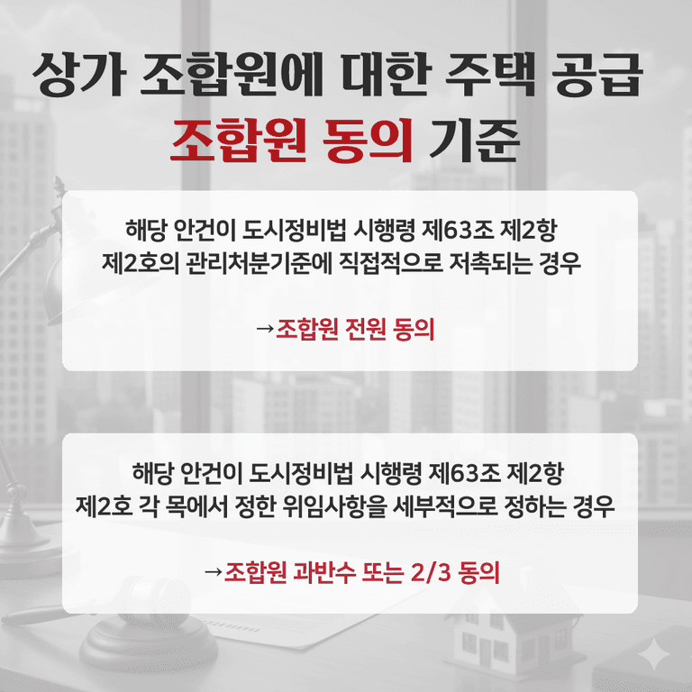 “이 사건 개정안은 관리처분계획의 기준을 '새로운 상가를 공급받지 아니한 경우로서 종전의 상가 가액이 분양주택의 최소분양단위규모 추산액에 20%를 곱한 금액보다 큰 경우'에도 상가 조합원에게 1주택을 공급할 수 있다는 내용으로 변경하는 것을 골자로 한다. 위 개정안에 따르면 조합이 상가를 충분히 건설하여 상가 조합원에게는 상가를 공급한다는 원칙을 지켜 대지 및 건축물을 균형 있게 배분할 수 있는 경우에도 상가 조합원이 상가 분양을 포기하는 방법으로 상가를 공급받지 않으면 상가 대신 주택을 공급받는 등 상가 조합원의 임의적 선택에 따라 상가 또는 주택을 분양받을 수 있게 된다. 이는 조합이 상가를 건설하지 않아 상가조합원에게는 상가를 공급한다는 원칙을 지키는 것이 불가능하거나(가목), 조합이 상가를 건설하여 공급하지만 건설되는 상가의 규모와 수 및 추정자산가액 등에 비추어 상가 조합원에게 부당한 결과가 발생하는 경우(나목, 다목)를 전제로 하여 상가 조합원에 대한 주택공급의 예외사유를 규정한 도시정비법 시행령 제63조 제2항 제2호 각 목의 기준을 완화하여 규정한 것이다. 그렇다면 이 사건 안건의 가결에는 도시정비법 시행령 제63조 제2항 단서에 따라 조합원 전원의 동의가 필요하다고 봄이 타당하다”