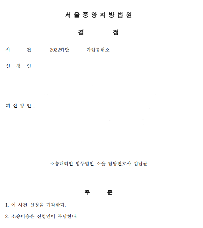 법원은 본 법인의 주장을 그대로 받아들여 신청인의 가압류 취소 신청을 전부 기각하였고, 소송비용 역시 신청인 부담으로 결정했습니다.