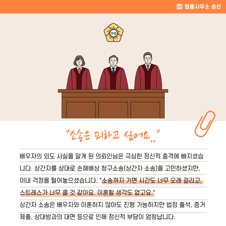 "소송까지 가면 시간도 너무 오래 걸리고, 스트레스가 너무 클 것 같아요. 이혼할 생각도 없고요."