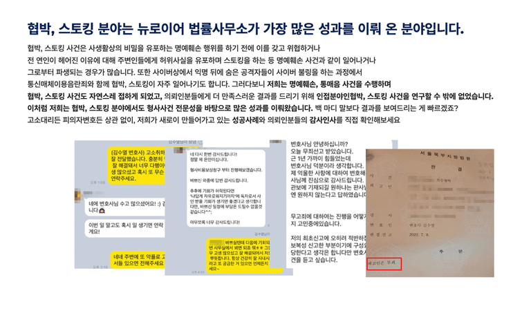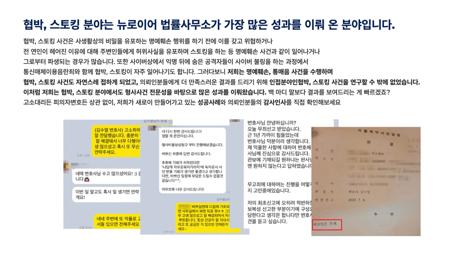 저희는 협박, 스토킹, 불안감조성죄 등 다양한 사건을 고소 방어를 통해 무혐의를 다수 이끌어왔습니다.