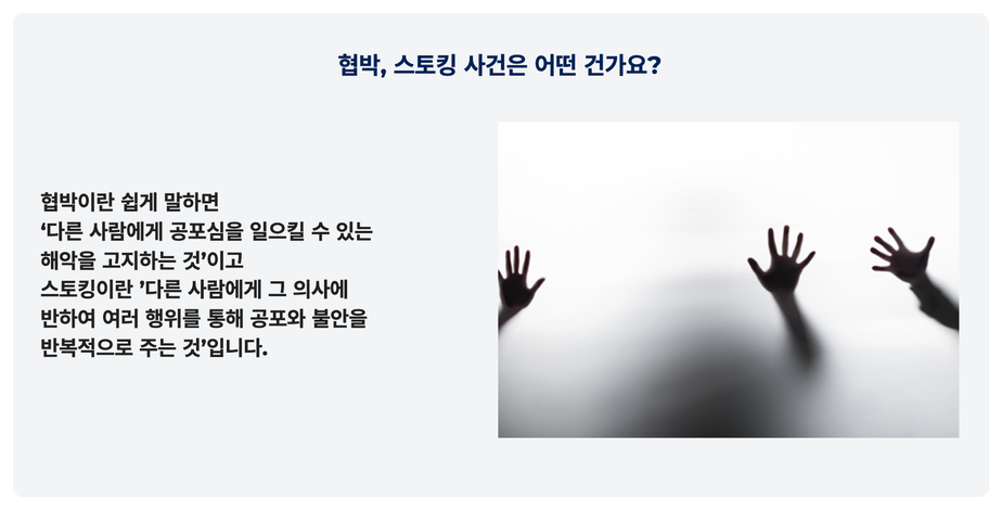 ![[협박/스토킹] 협박 성립요건? 무혐의 이끄는 핵심 2가지#협박](/_next/image?url=https%3A%2F%2Fd2ai3ajp99ywjy.cloudfront.net%2Fuploads%2Ftitleimage%2Foriginal%2F5b1a11eb3caf680b54b2456b-original.jpg&w=3840&q=75)