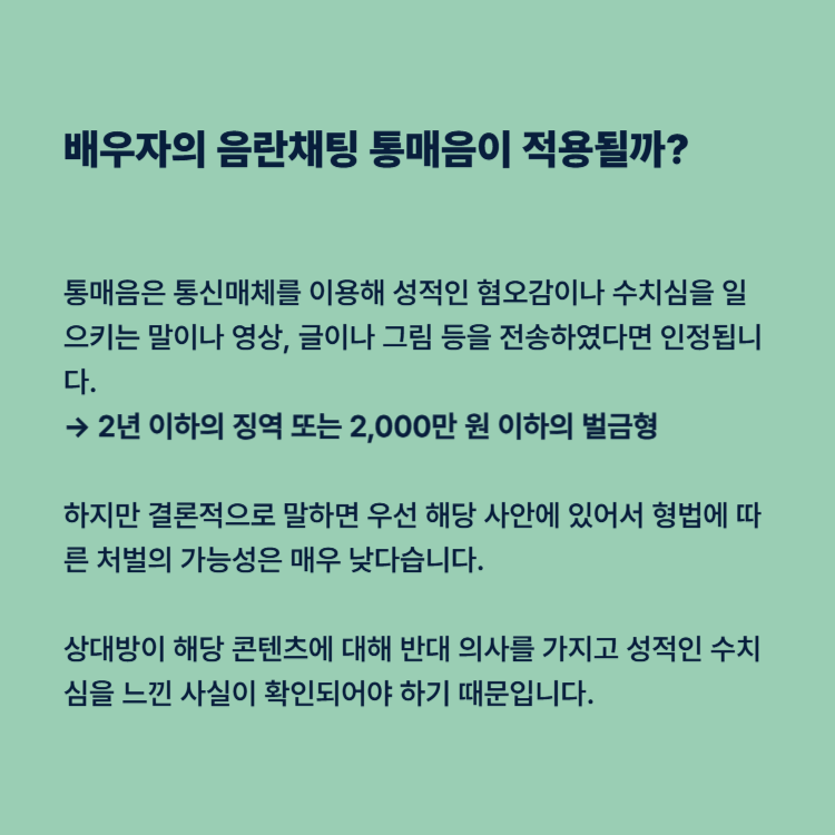 하지만 결론적으로 말하면 우선 해당 사안에 있어서 형법에 따른 처벌의 가능성은 매우 낮다습니다. 위 조항에서 알 수 있듯이, 상대방이 해당 콘텐츠에 대해 반대 의사를 가지고 성적인 수치심을 느낀 사실이 확인되어야 하기 때문입니다.