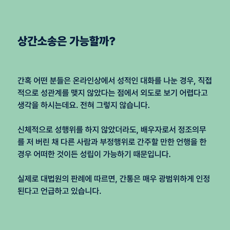 간혹 어떤 분들은 온라인상에서 성적인 대화를 나눈 경우, 직접적으로 성관계를 맺지 않았다는 점에서 외도로 보기 어렵다고 생각을 하시는데요. 전혀 그렇지 않습니다.