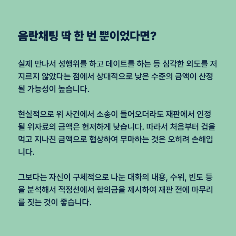 그보다는 자신이 구체적으로 나눈 대화의 내용, 수위, 빈도 등을 분석해서 적정선에서 합의금을 제시하여 재판 전에 마무리를 짓는 것이 좋습니다.