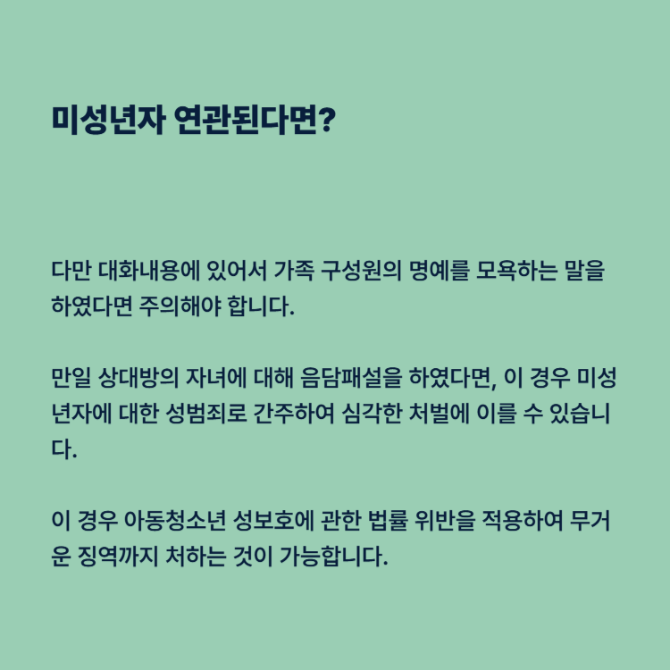 다만 대화내용에 있어서 가족 구성원의 명예를 모욕하는 말을 하였다면 주의해야 합니다. 만일 상대방의 자녀에 대해 음담패설을 하였다면, 이 경우 미성년자에 대한 성범죄로 간주하여 심각한 처벌에 이를 수 있습니다.