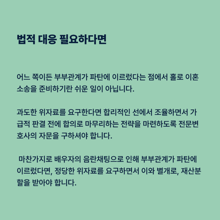 과도한 위자료를 요구한다면 합리적인 선에서 조율하면서 가급적 판결 전에 합의로 마무리하는 전략을 마련하도록 전문변호사의 자문을 구하셔야 합니다. 마찬가지로 배우자의 음란채팅으로 인해 부부관계가 파탄에 이르렀다면, 정당한 위자료를 요구하면서 이와 별개로, 재산분할을 받아야 합니다.