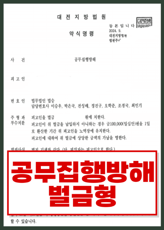 앞서 소개해드린 공무집방 사건의 경우 검찰에 의뢰인에 대하여 구약식기소를 하였고, 담당 재판부에서도 그와 같은 취지로 약식명령하여 의뢰인은 공판절차를 진행하지 않고 벌금형으로 선처받아 사건이 마무리 될 수 있게 되었습니다.
