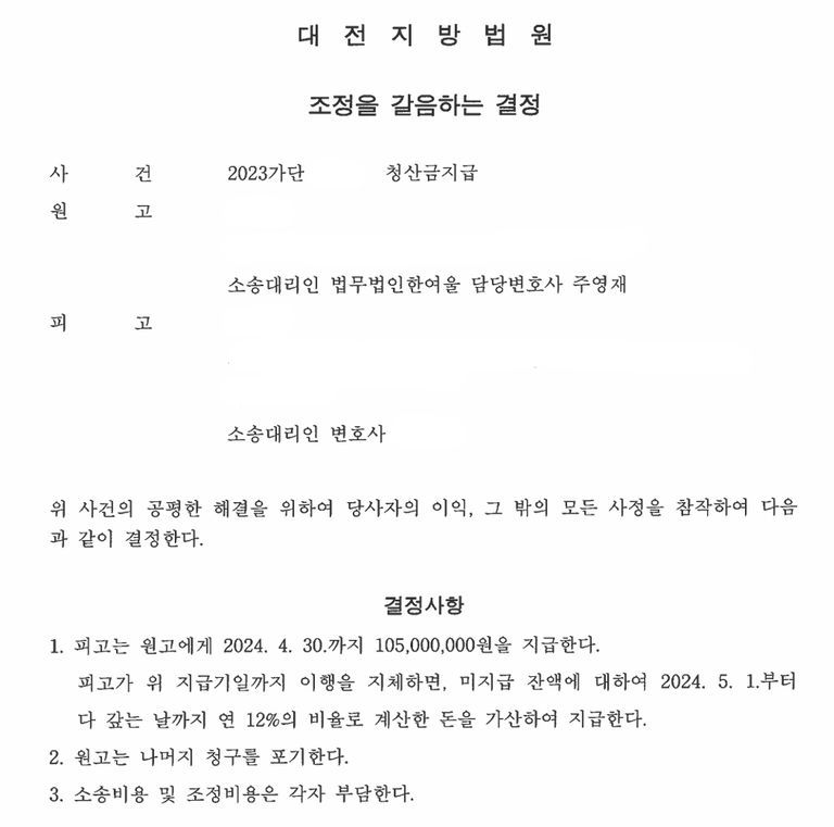 재판 과정에서 주영재 변호사의 논리적인 주장과 명확한 증거 제출이 받아들여졌고, 법원은 “피고는 원고(의뢰인)에게 105,000,000원을 지급하라”는 내용의 조정을 갈음하는 결정을 내렸습니다.