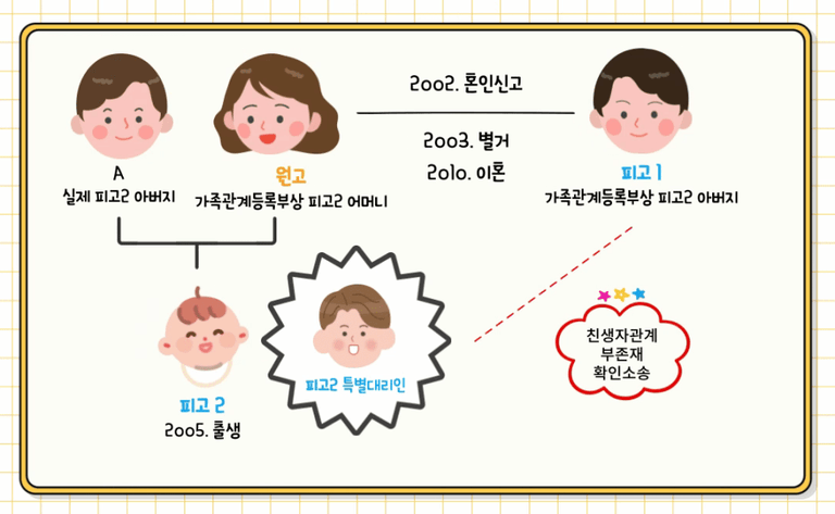☞ 별거 중 '원고'는 'A'를 만나게 되었고, 2005. '원고'와 'A'사이에서 '피고2'가 태어났습니다.