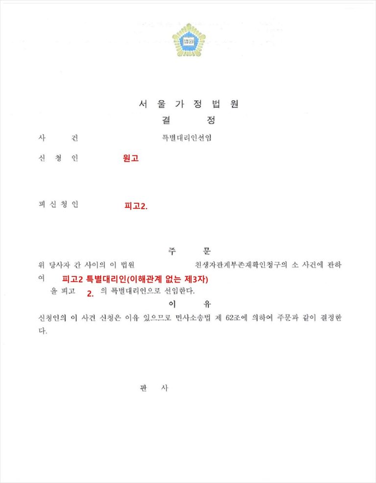 따라서 친생자관계부존재확인소송의 소장을 접수하면서 동시에 특별대리인선임신청을 하였습니다.