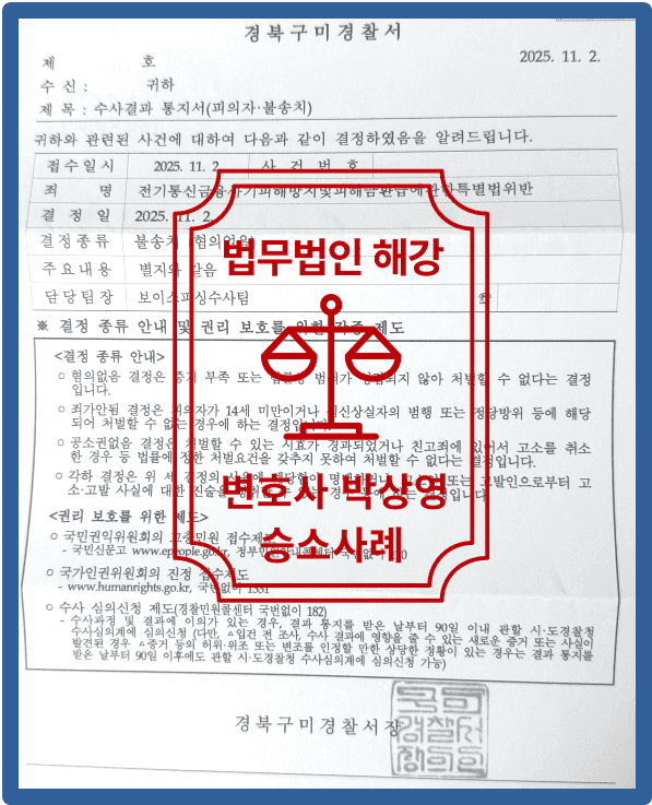저희 법무법인 해강은 법리적인 검토를 통하여 의뢰인 상황에 맞춘 변호인 의견서 등 작성을 통하여 의뢰인을 위해 최선을 다하였고 이에 [불송치 결정]을 이끌어냈습니다.
