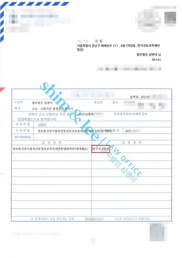 - 심앤이가 제출한 자료와 의견서를 검토한 담당 검사님은 곧바로 가해자에 대해 명예훼손죄로 기소 결정을 내리셨고, 가해자는 재판에서 자신의 행위에 대한 심판을 받게 되었습니다.
