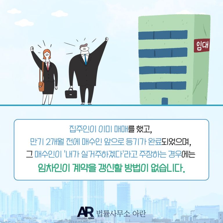 따라서 집주인이 이미 매매를 했고, 만기 2개월 전에 매수인 앞으로 등기가 완료되었으며, 그 매수인이 '내가 실거주하겠다'라고 주장하는 경우에는 임차인이 계약을 갱신할 방법이 없습니다.