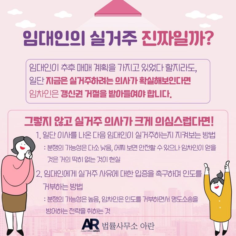 그 중 첫 번째, 일단 이사를 나온 다음 임대인이 실거주하는지 지켜보는 방법의 경우, 임대인이 실거주하지 않고 제3자에게 매매를 하는지만 지켜보면 되니 분쟁의 가능성은 다소 낮습니다.