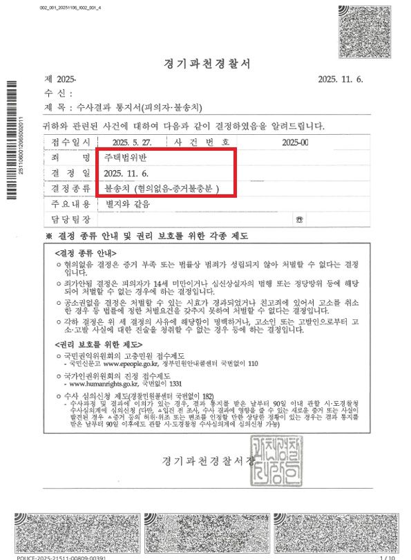 이 사건은 경찰에서 '불송치(혐의없음)'으로 종결되었습니다.