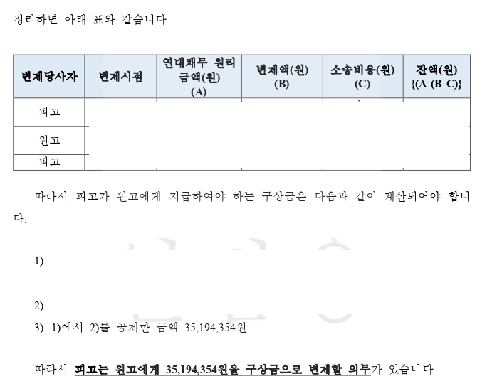 이에 원고의 주장과는 달리 연대채무의 잔여원리금을 계산한 후 채권자에게 모두 변제하였으며 피고가 잔여 연대채무를 변제함에 따른 구상금 채권을 원고의 채권과 상계하여 이에 따라서 법원에 (i) 변제충당 법리에 따른 잔여원리금이 존재함을 주장하였고, (ii) 추가적으로 변론기일을 지정받아 잔여 원리금을 변제한 후 추가적으로 피고가 취득한 구상금 채권과 원고의 구상금 채권의 상계를 주장하였습니다.