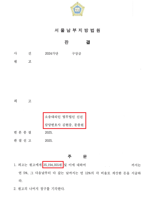 법원은 저희가 주장한 내용을 모두 받아들여 원고가 청구한 금액 84,804,439원 중 35,194,355원 만을 인정하였습니다.